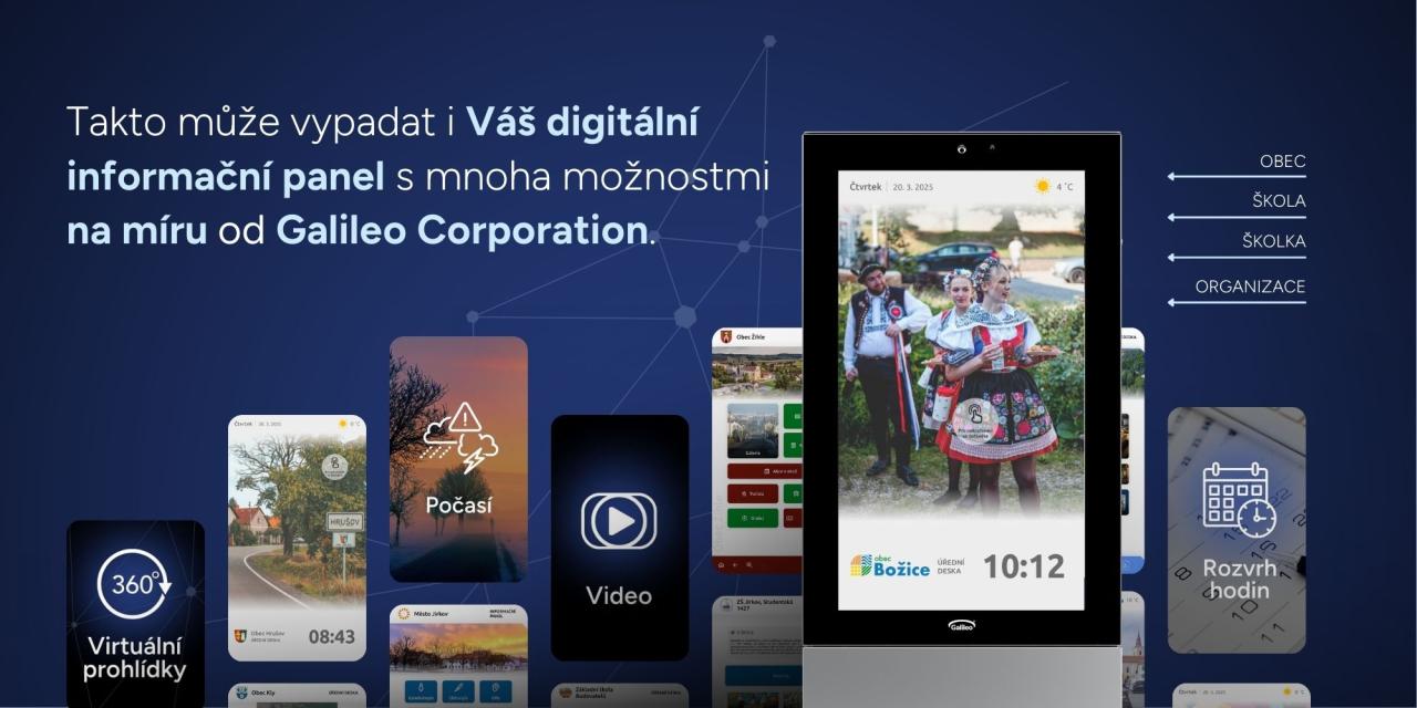 S digitálním informačním panelem od Galileo Corporation máte možnost rychle a jednoduše zapojit komunitu do aktuálního dění ve vaší obci, škole nebo organizaci. Poskytujeme nepřeberné možnosti zobrazení obsahu, např.